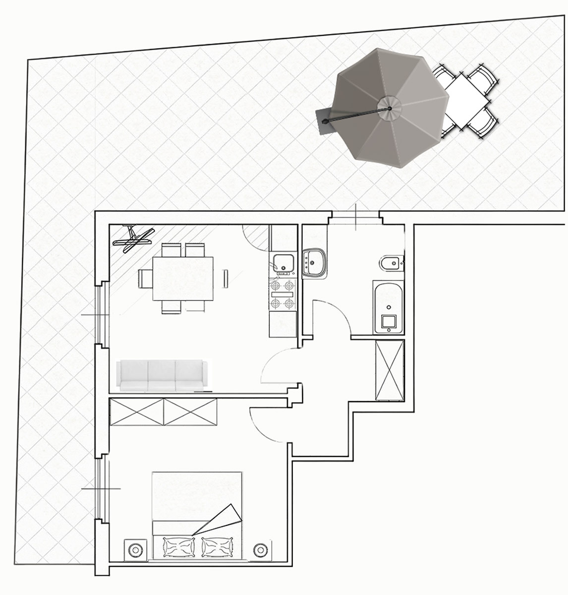 Neben der privaten Terrasse haben Sie direkten Zugang zur großen Gemeinschaftsterrasse.